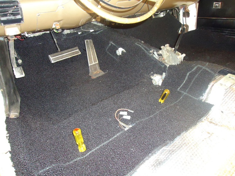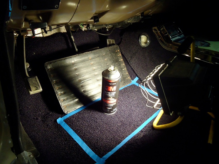 If you have the mud/foot pads that are in my L (quite heavy rubber and aluminum affairs), removal from the old carpet should be pretty easy. If the carpet is as old (well, it has to be doesn't it) as mine, and as rotten, the things almost fall off. They were sewn on, and any threads still left can be cut and just about rubbed off. Cleaning the things well, on both sides is important--the top cosmetically, and the bottom for adhesive purposes. The things may have warped a bit, so warming them and then weighting them to become flatter will make a better application. I placed my pads about an inch ahead of the ledge on which the seat base is bolted. I centered the right side pad, and ran the right side of the left mud pad at the right edge of the accelerator. I used spray contact cement, and actually read and followed the directions. When I put the pads in place with the cement dried to the touch, I then placed a regular cinder block on each for 24 hours. I don't know if the weight made a difference, but the things are still stuck where I put 'em.