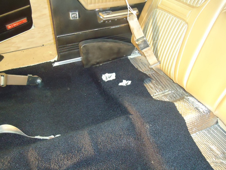 Fitting the rear carpet is easy. You will need to make cuts for the prongs which hold the rear seat down, and you will have to trim at the sides. I found that the carpet going over the hump is slightly larger in diameter than the hump--that it is not a tight fit, and there was no way to make it so. Nonetheless, the rear piece is easy. If you have front seat belts, you will want an awl to locate the bolt holes, followed by "x'ing" them with the knife. When I had the hole, I then put a couple of strips of black duck tape around the edge of the hole to keep the edge fairly protected, and to keep the seat belt bolt from grabbing carpet as it turned in.