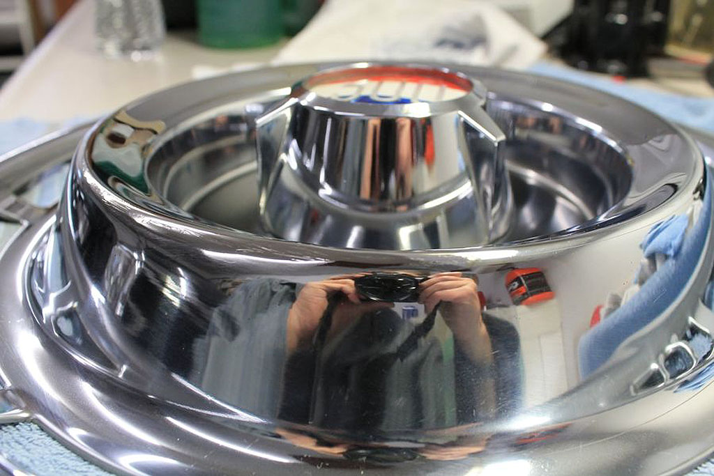 It is worth the effort to work on the wound. On the right is the "before" photo. The rash is visible on the lower right. The photos below are the "after." I sanded with 180 grit and then 400. Then using the buff wheel I started with emory compound which didn't do a doggone thing. I spent the most time with the stainless compound on a spiral-sewn wheel. It removes the sanding scratches and minor abrasions but not the deep stuff. However, it improves appearance to the point that it is no longer noticeable except up close and under bright light. The last step is white rouge on a loose flannel wheel for the final buff and to bring up the shine to equal to or greater than the chrome center. This took about 2 hours of work. While it is not "fixed", it is noticeably better and this wheel cover has been saved.
