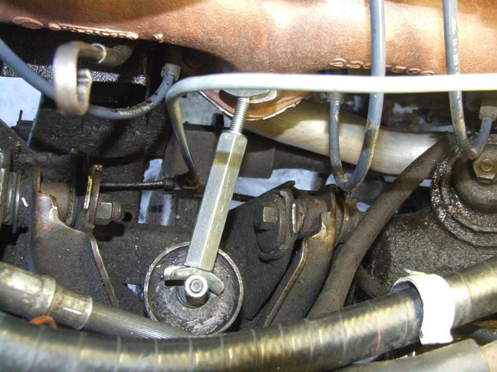 You then remove your socket and assemble the top rubber bushing and washer, and install top nut. If the top of the shock rod is not centered in the hole, the belt tightener can be put into service here as well. Reinstall the rubber biscuit on the control arm.