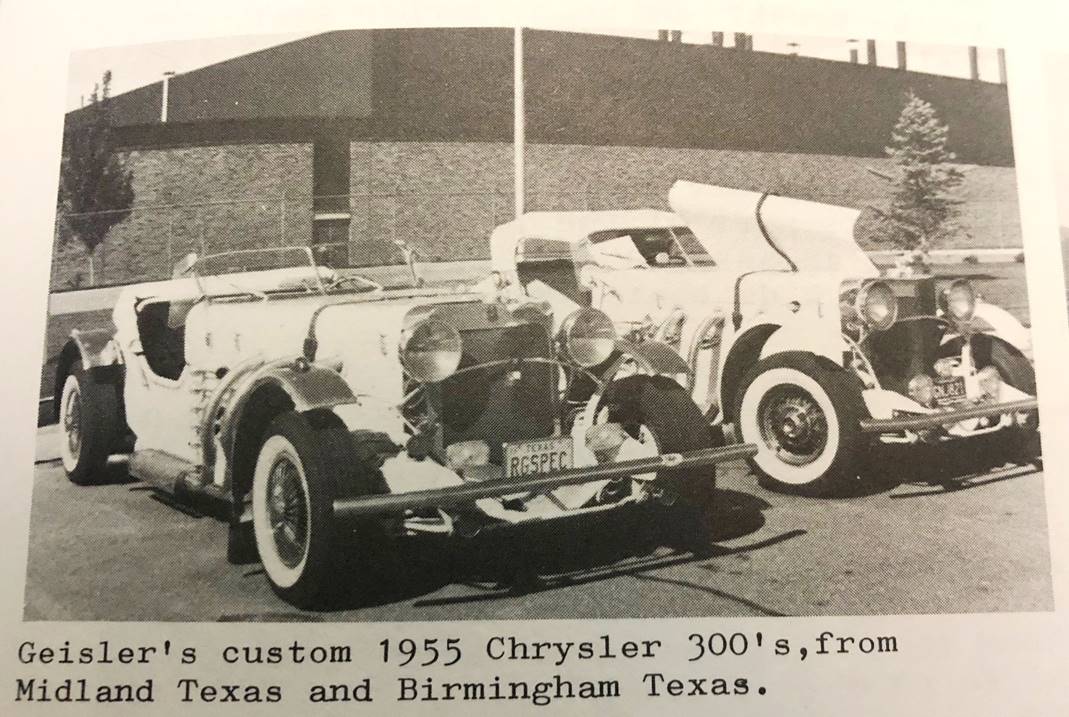 Last week sorting through some old WPC newsletters I found a photo of them. This photo was taken at the WPC national meet in Denver in 1976. As I recall they were built using complete C300’s when they were new cars or nearly new. They had the complete C300 drivetrains, the 150 MPH speedo and other 1955 Chrysler gauges and knobs along with the shifter on the dash. The brothers took some heat from purists for cutting up two C300’s but were far from apologetic, they were proud of their creations and enjoyed showing them off.