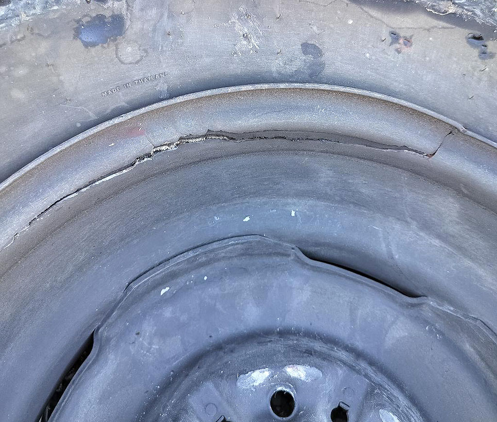 After I removed the wheel, I was turning it looking for a nail or something in the tire tread. Everything looked good until I looked at the backside. The rim was cracked. It was about 8" long. I'm lucky that I wasn't driving at high speeds on the highway as things could have gone from bad to worse very quickly.