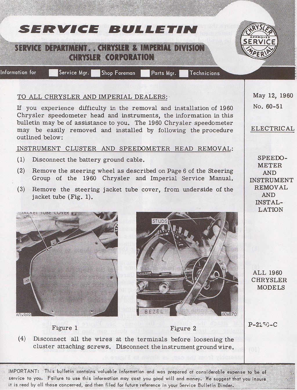 1960 Speedometer Removal & Installation This article is for the 1960. 1961, 62 is similar; the trim bezel in figure 2 is attached with screws not studs. Back to the technical articles page
