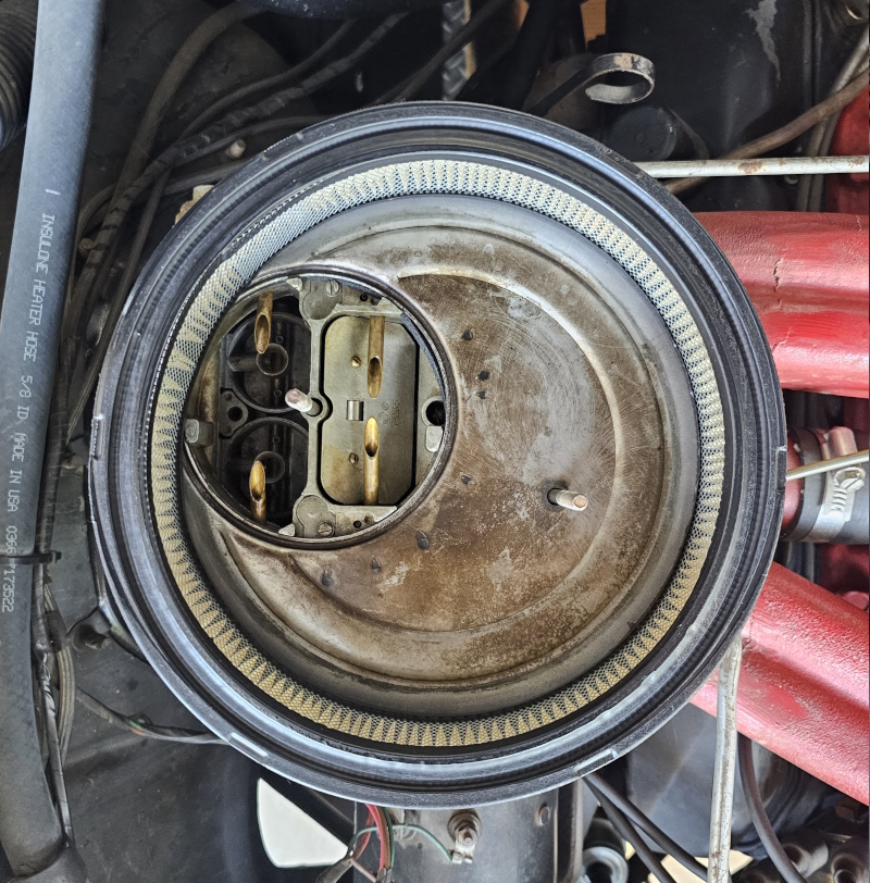 The 300F, 300G, 300H 405hp (dealer installed rams), 300J and 300K ram induction engines have two small round air cleaners. They are installed onto the carburetors in a particular way. Attached to the bottom of the base plate is a piece of steel that indexes the air cleaner on the carburetor. They will fit in one more orientation but they should only be mounted one way. The lids can be installed in two ways but have notches for clearance for parts of the air conditioning system on cars so equipped. The notch on the passenger side air cleaner should always face the heater box. The notch on the driver side air cleaner could face the center of the engine or out toward the fender. Most press photos show the driver side notch facing out toward the fender. Note that if the notch faces out, the service decal will be facing the firewall. Click here for more information on service decal placement.
