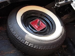 Blue Streak tire in 300F convertible that appears to have Captive-Air Safety Shield liner installed. Note space between whitewall and rim. Car was coded 96 for the standard Blue Streak tires. Unfortunately, the tire was lost during restoration of car.