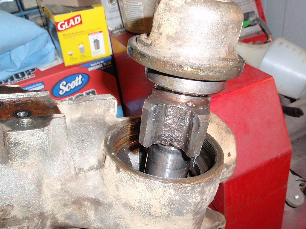 Sector shaft partially removed. The special nut holding this and the internal parts in can usually be removed with a blunt chisel and a hammer. The center tooth is broken off on this one and the box will not be going back together. The 59 Imperial that this was in had suffered an accident on the right fender, and was likely hit on the wheel also. Surprisingly enough, this car still steered, although there was a lot of play in the wheel.
