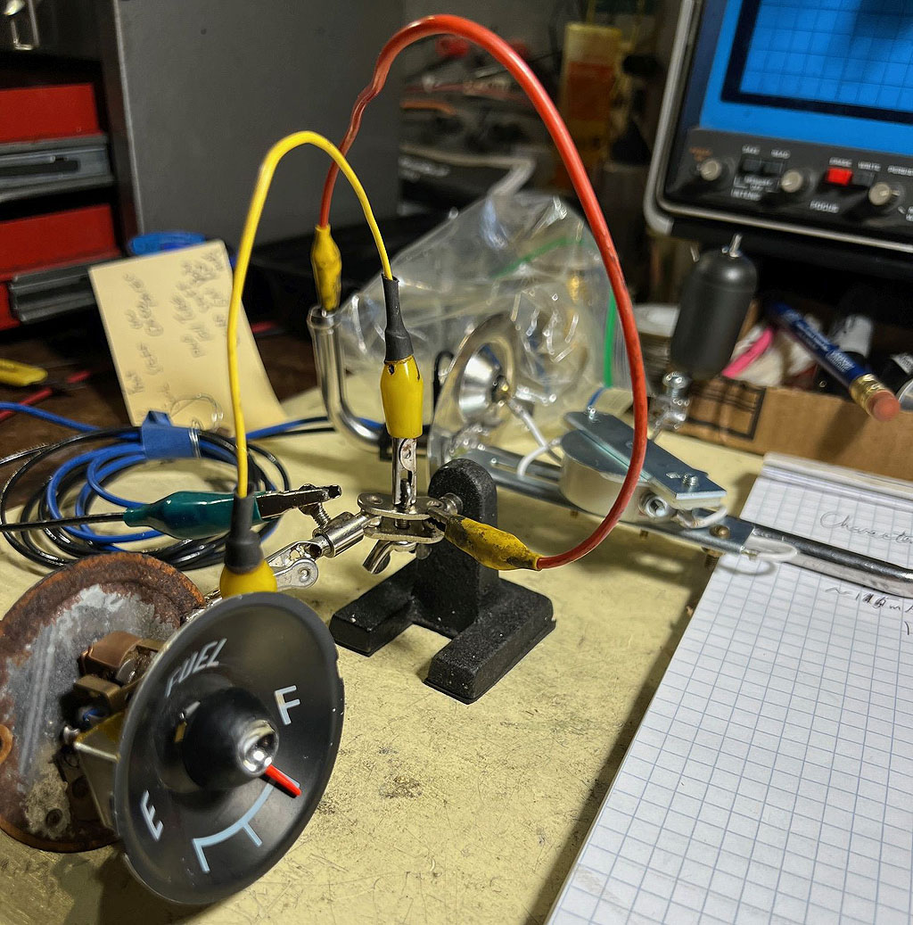 Now that we have the numbers the gauge wants, let's see what numbers the sending unit gives us. With the float arm sitting on the bottom stop, the sender is 200 ohms and the needle is slightly above E. Here, on the bottom stop, the sender is at maximum resistance. Relocating the float or bending the sending unit arm won't improve accuracy, but why would you need to? Having a little reserve in the tank is a great thing to avoid running out of gas. While a perfect sending unit would have 240 ohms at E, a sending unit with 200 is very much OK. John