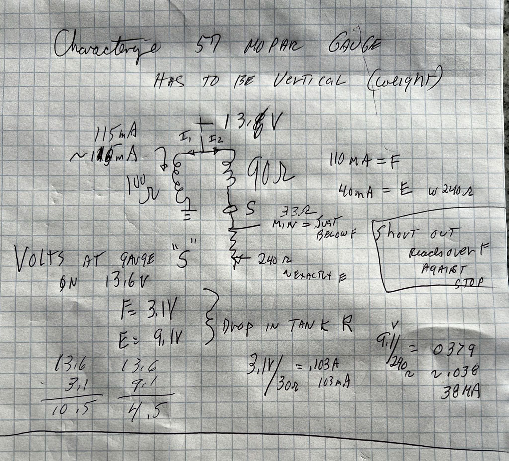 The coils are wired so they each get the same generator output (11 to 14 volts). If generator output increases, both coils get equally stronger and no matter where the needle is on the dial, it does not change position. For this reason, no voltage regulator is needed. One coil is wired for full strength all the time. The second coil is weaker. It actually has a little less volts due to the drop at its ground end in the tank resistor. To compensate, the gauge is designed such that the needle rests on the F mark at float full up. If you were to ground the tank lead, the needle goes beyond F. Going beyond the E or the F is not a good thing as the needle can stick off scale. As the float drops more ohms are added to the second coil. Current decreases, magnetic strength decreases. The full strength coil begins to win the tug of war and the needle moves toward E. At 200 ohms, float full down, the needle is just above E. Should your needle go off scale below E, look for a broken wire or intermittent contact sender. John had a gauge where the needle stuck below E, you can read about his repair here. For those that like numbers and test results, John measured coil volts. With the input held at 13.6 volts, at F the coil is seeing 10.5 volts (a drop of 3.1 volts due to 30 ohm resistance from the sender). At E the coil sees 4.5 volts due to the 200 ohm resistance.
