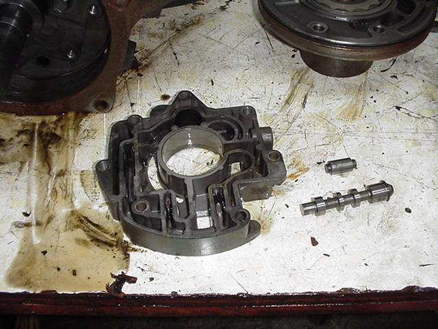 - Pic 10a Output shaft support showing machined surface that rear pump gears ride on. Very good condition.